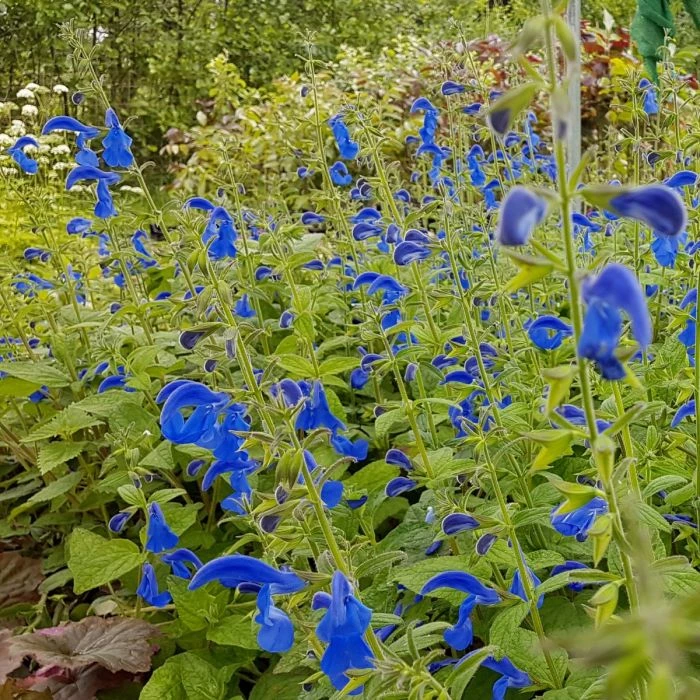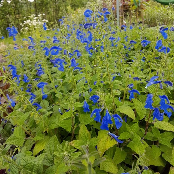 Der in kräftigem Blau blühende Salbei ist eine knollenbildende Staude. Die Blüten mit weit geöffnetem Schlund sind bis zu 5 cm groß. Die Belaubung ist mittelgrün und leicht behaart. Eine sehr attraktive und vor allem lange blühende Staude, die sehr pflegeleicht ist. Sieht schön zu Phlox und Malven aus.