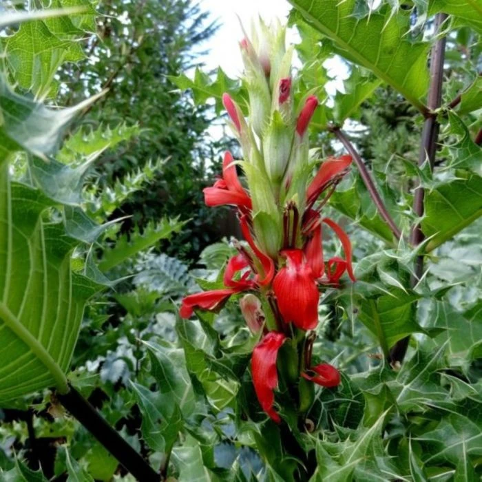 Seltenheit – atemberaubender rotblühender Acanthus mit silbrig-grüner Belaubung und violetten Stielen. Die Blätter sind am Rand gekräuselt und steif. Strauchiger Wuchs – idealer Weise an einem windgeschützten, sonnigen Standort. Nach Abfall der Blätter die Pflanze zurückschneiden und mit Mulch oder Tannengrün vor starkem Frost schützen oder bei Kübelbepflanzung wird eine Überwinterung z.B. im Wintergarten empfohlen.