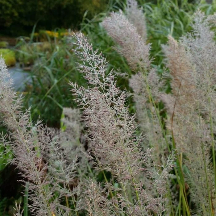 Eines der schönsten Ziergräser ist dieses Diamant Reitgras. Die filigranen Blütenrispen haben einen rosaschimmernden Farbton, im Morgentau funkeln sie wie Diamanten. Straff aufrechter Wuchs. In Einzelstellung am schönsten. Das Diamantgras begeistert hier in Kombination mit Prachtkerzen.