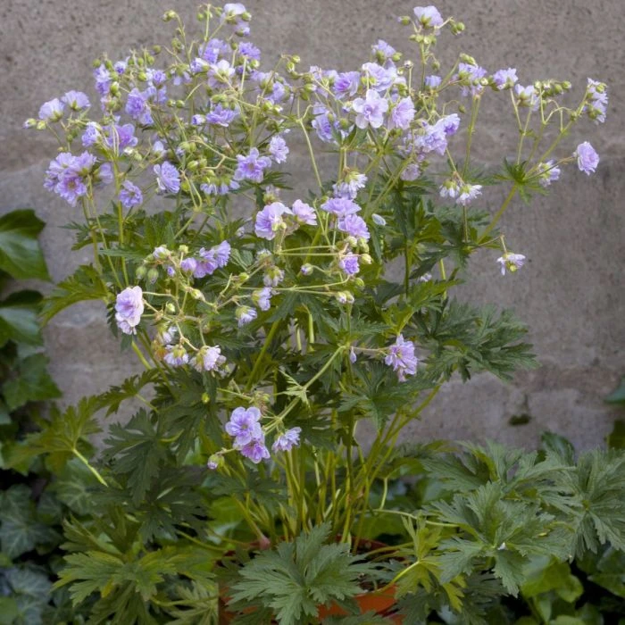 Auch Du wirst auf Wolke sieben schweben, wenn Du diese preisgekrönte und winterharte Storchenschnabel Pflanze namens Geranium pratense Cloud Nine mit eigenen Augen siehst. Sie zeichnet sich durch voll gefüllte, hellblaue Blüten aus, die über feinem Laub schweben. Diese Blütenpracht erstreckt sich vom späten Frühjahr bis zum Hochsommer und blüht dann erneut vom Spätsommer bis in den Herbst. Dieses Geranium ist auch unter dem Namen Storchenschnabel bekannt, der sich auf die Form der Samenkapseln bezieht, die sich entwickeln, sobald die Blüten verblüht sind. Gefüllte Geranium Pflanzen sind sehr begehrt, einfach zu kultivieren und widerstandsfähig gegen Schnecken, Hirsche und Kaninchen. Sie eignen sich hervorragend als Schnittblumen für Arrangements im Haus und halten bis zu 10 Tage in einer Vase. Geranium Cloud Nine ist trockenheitstolerant und anspruchslos in Bezug auf Bodenverhältnisse, wenn sie in der Sonne oder im Halbschatten angebaut wird. Sie erreicht eine Höhe von ca. 90cm und breitet sich auf 50cm aus. Diese voll winterharte Staude kann das ganze Jahr über im Freien angebaut werden.