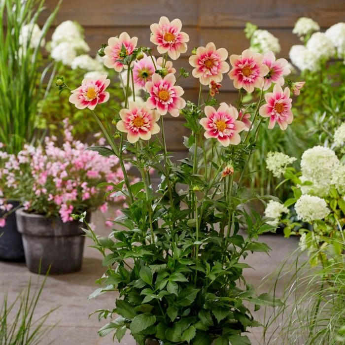 Diese Pflanze zeichnet sich durch ihre kräftigen, aufrechten Stängel aus, die von großen Blüten mit apricot äußeren Blütenblättern gekrönt werden. Diese umgeben einen rosafarbenen Kragen aus kürzeren inneren Blütenblättern, der inmitten von dunkelgrünen Blättern wunderschön zur Geltung kommt. Mit einer Höhe von 90 cm und einer Breite von 60 cm eignet sich diese Pflanze perfekt für Kübel.