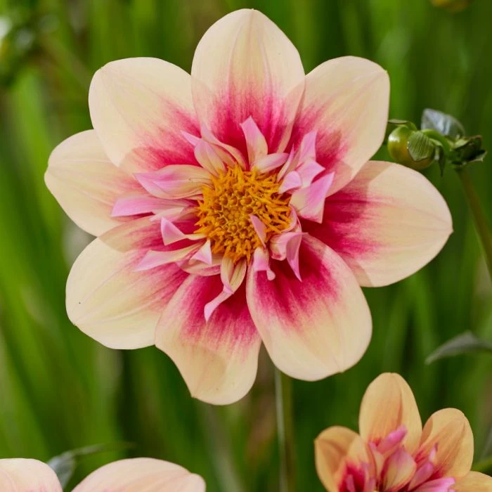 ‚Rhubarb & Custard‘ ist eine einzigartige Dahlie mit auffälliger Blütenpracht. Die Blüten sind zweifarbig und haben eine lebhafte Kombination aus leuchtendem Apricot-Rosa und Gelb. Die Blütenblätter sind harmonisch angeordnet und bilden ein atemberaubendes Farbspiel. Die Pflanze wächst auf kräftigen, aufrechten Stängeln und erreicht eine Höhe von etwa 90 cm. Sie ist eine wahre Bereicherung für jeden Garten und wird mit ihren lebendigen Farben alle Blicke auf sich ziehen.