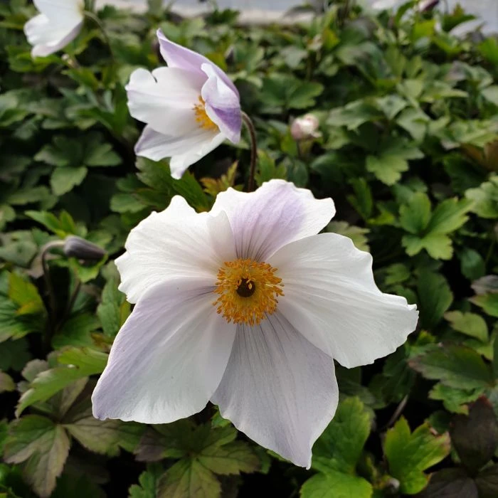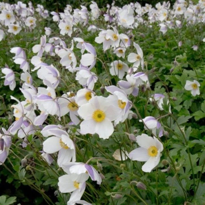 Die Herbst-Anemone ‚Wild Swan‘ ist eine wunderschöne mehrjährige Staude mit weißen zweifarbigen Blüten. Sie gedeiht gut in halbschattigen Bereichen und bildet dichte Gruppen. Die Blüten sind strahlend weiß mit gelber Mitte und wirken besonders vor dunklem Hintergrund. Die Pflanze ist winterhart und pflegeleicht, benötigt jedoch Schutz vor starkem Regen. Sie vermehrt sich durch Samen und unterirdische Wurzeln. ‚Wild Swan‘ passt gut zu niedrigen Farnen, Bodendeckern und Hortensien. Sie kann auch in Kübeln auf halbschattigen Terrassen gehalten werden.