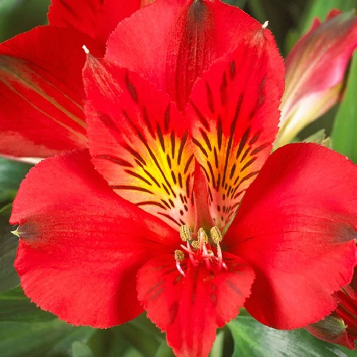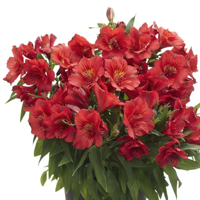 Die feurig rote Blütenpracht der Alstroemeria Kate erstrahlt unermüdlich ab dem späten Frühjahr bis tief in den Herbst hinein über der dunkelgrünen Belaubung. Die Blüten sind 5 bis 6 cm groß. Der Dauerblüher eignet sich ideal zur Kübelbepflanzung für den Balkon, die Terrasse oder den Innenhof. Aber auch im Beet entzückt die Pflanze mit einer üppigen Blütenzahl. Die peruanische Lilie ist pflegeleicht und wächst kompakt und niedrig. Inkalilien lassen sich auch gut als Zimmerpflanze halten. Die Pflanzen sind winterhart, wenn sie einmal gut angewachsen sind. Bei starkem Frost wird ein Winterschutz empfohlen. Bei Kübelpflanzung ist ein Winterschutz erforderlich. Für eine reiche Blüte einmal im Monat düngen.
