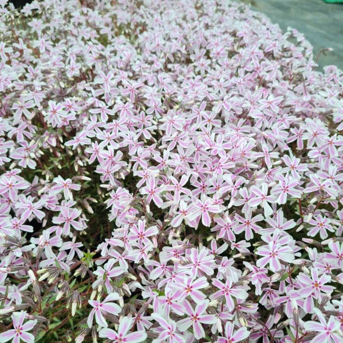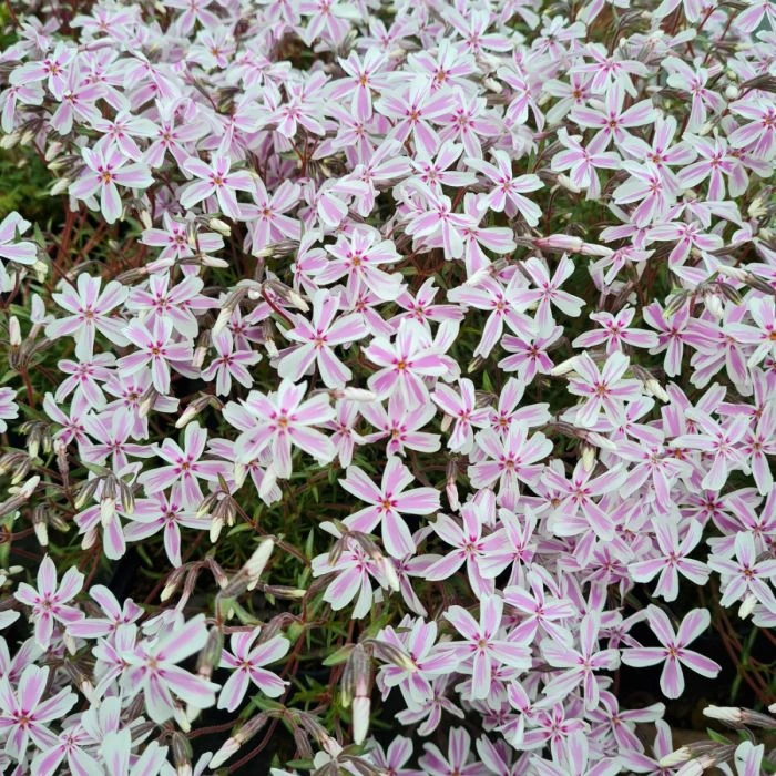 Der Polsterphlox ‚Kimono Pink-White‘ (Phlox subulata) ist eine außergewöhnlich attraktive Staude, die mit ihrer einzigartigen Farbkombination jeden Garten bereichert. Die Blüten dieser Sorte präsentieren sich in einem bezaubernden Rosa-Weiß, das in der Blütezeit von April bis Mai einen spektakulären Blickfang bietet. Mit seiner niedrigen, teppichbildenden Wuchsform, die Höhen von ca. 10 bis 15 cm erreicht, eignet sich ‚Kimono Pink-White‘ hervorragend als Bodendecker, für Steingärten, zur Bepflanzung von Mauerkronen oder als farbenfroher Rahmen für Gartenwege.