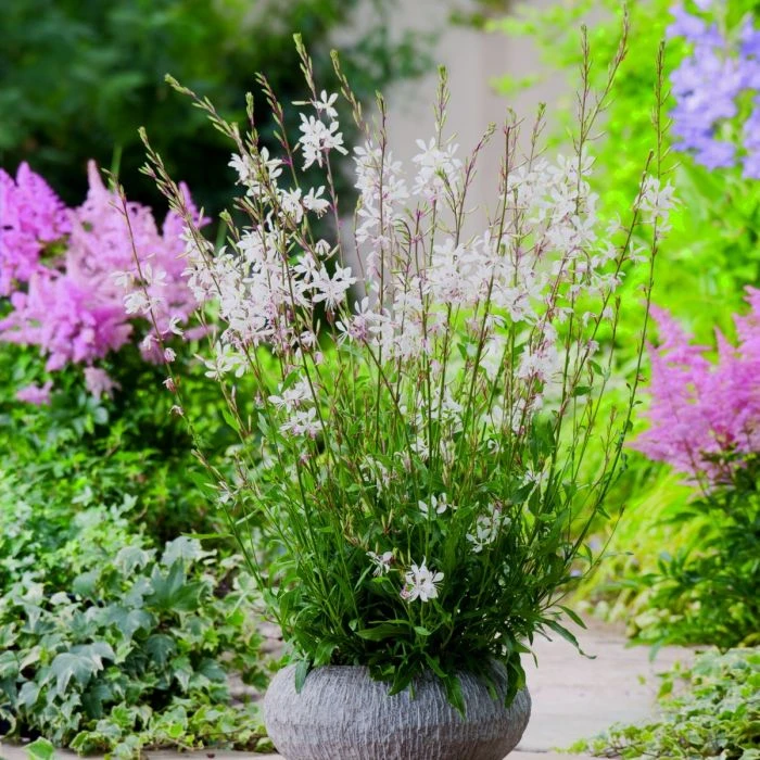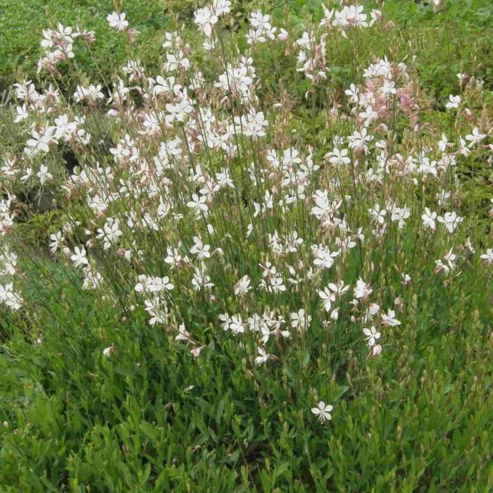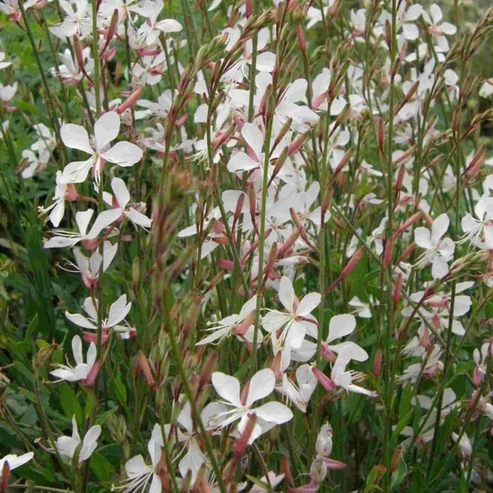 Elurra ist verbesserte Gaura-Sorte mit einer einheitlichen Blütenpracht und verkürzten Blütenständen. Ab Juli beginnen die weißen Schmetterlings-Blüten über der mittelgrünen Belaubung zu schweben – bis spät in den Herbst hinein. Durch die zahlreichen Traubenblüten sind die Blütenrispen auch gut als Schnittblume zu verwenden. Die Staude blüht sehr lange und bis in den Herbst hinein. Die bezaubernde Pflanze sollte in keinem Beet oder Kübel fehlen – eine wahre Bereicherung. Bei starkem Frost wird ein Winterschutz empfehlen, Staunässe unbedingt vermeiden.