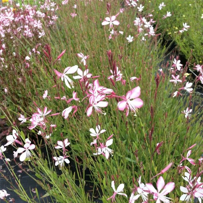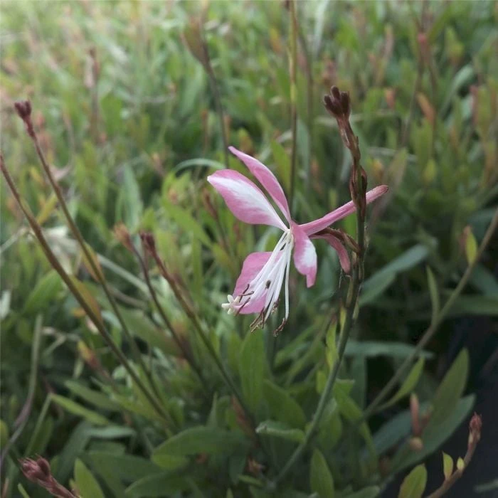 - Garten-Prachtkerze ‚Rosy Jane‘ (Gaura lindheimerii): Setze die „Rosy Jane“ als zentrale Pflanze in den Pflanzkübel. Die zarten, rosafarbenen Blüten und die filigranen Stiele sorgen für eine elegante Erscheinung.