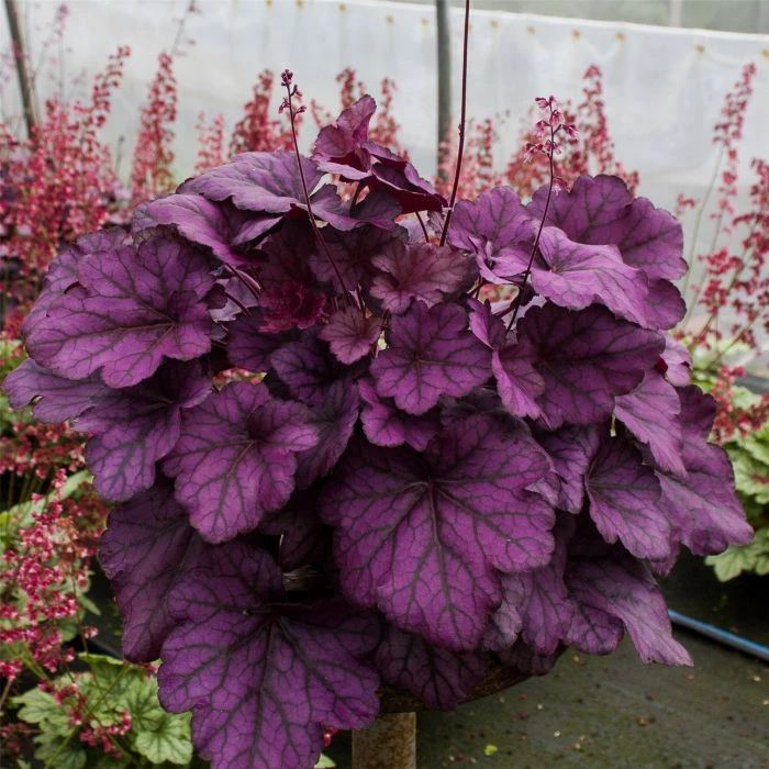 Wild Rose ist eine sehr robuste und ausdrucksstarke Heuchera-Sorte. Die Blattfärbung bringt auch während der tristen Jahreszeit viel Farbe ins Beet oder auch in den Kübel. Das Laub ist im Frühjahr heller – eher rosa – als im Spätsommer – da eher tief dunkelviolett. Die Pflanzen sind wintergrün und haben einen besonders kompakten und kräftigen Wuchs. Ideal für kleine Gärten oder zur Kübel- oder Schalenbepflanzung. Auch für den Steingarten geeignet.