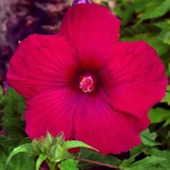 Die schimmernden, samtig roten Riesenblüten der Sorte My Valentine bringen viel Farbe ins Beet während der sehr langen Blütezeit. Die pflegeleichte Staude hat einen buschigen, viel verzweigten Wuchs und eine sehr gute Winterhärte. Die Belaubung ist dreilappig und grün. Ideal für den Kübel auf Terrasse, Balkon oder auch im Beet für feuchte Standorte. An normalen Standorten sollte die Pflanze häufiger gegossen werden. Ein kräftiger Rückschnitt im Spätherbst sorgt für reichlich Blüten im kommenden Jahr. Hibiskus Pflege: Regelmäßiges Düngen ab dem Frühjahr sorgt für eine kräftige Blüte (alle 2 bis 3 Wochen). Wie alle Riesen-Hibisken treibt die Sorte sehr spät aus, Ende April/Anfang Mai, je nach Witterung.