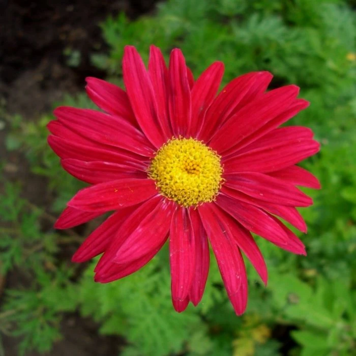 - Farbpracht: Die tiefroten Blütenblätter der Bunten Margerite ‚Robinsons Rot‘ bilden einen kräftigen Kontrast zu den gelben Staubgefäßen.
