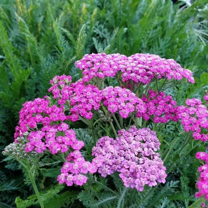 Schöne farbkräftig blühende Schafgarbe. Kräftiger, buschiger Wuchs. Zur Blütezeit erscheinen die Blütendolden mit großen leuchtend pinkfarbenen Einzelblüten über der dichten frischgrünen Belaubung. Lange Blütezeit. Auch für den Vasen-Schnitt geeignet. Bienen- und Schmetterlingsmagnet.