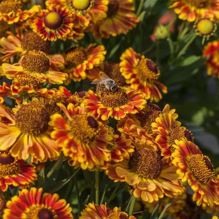 Die Sonnenbraut (Helenium autumnale) MARIACHI Fuego mit feurigen, mehrfarbigen Blüten geben der Sorte ihren Namen und setzen wertvolle farbkräftige Akzente im Spätsommer und Herbst. Niedrige Sonnenbraut mit kompaktem, gut verzweigter Wuchs. Die Pflanzen sind reichblütig und standfest. Das Auskneifen verwelkter Blüten fördert den Neuaustrieb neuer Blüten. Die Blüten eignen sich auch gut als Schnitt für die Vase. Nektarpflanze für Bienen und Schmetterlinge. Ideal auch zur Kübelbepflanzung für den Balkon oder die Terrasse.