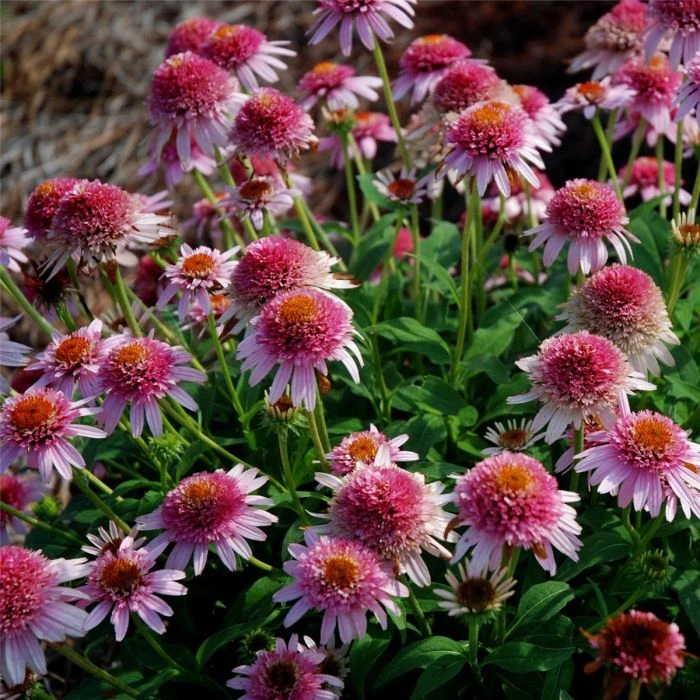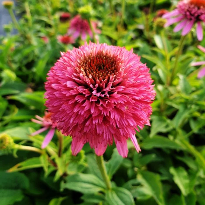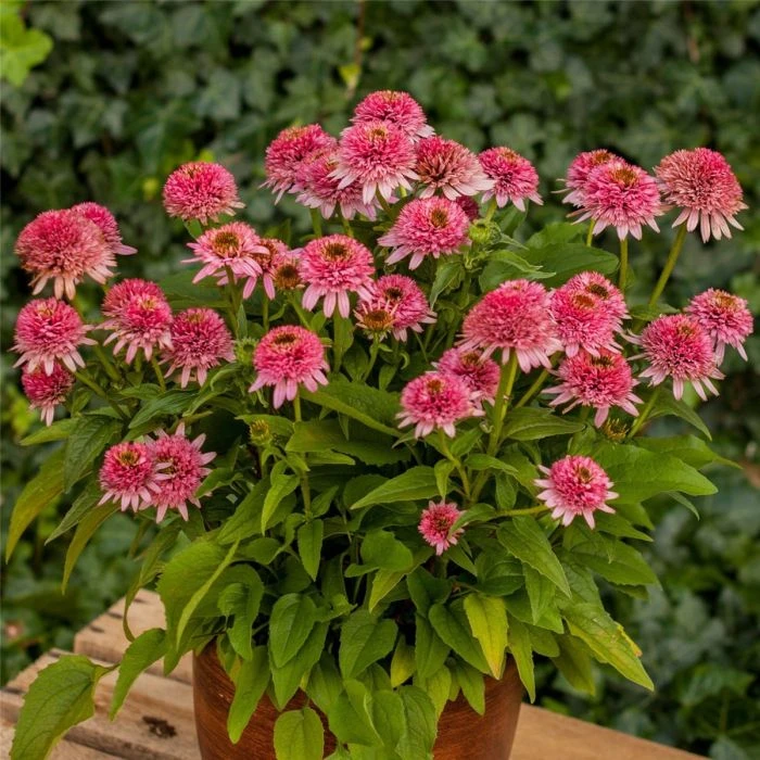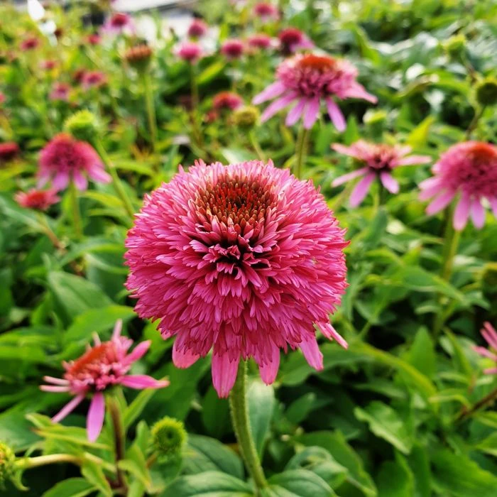 Niedriger, gut verzweigter Sonnenhut (Echinacea) mit großen, pinkfarbenen gefüllten Blüten. Ideal auch zur Kübelbepflanzung für Terrasse und Balkon. Langanhaltende und üppige Blüte bis in den Herbst. Sehr gut als Schnittblume geeignet. Die duftenden Blüten ziehen viele Schmetterlinge an.