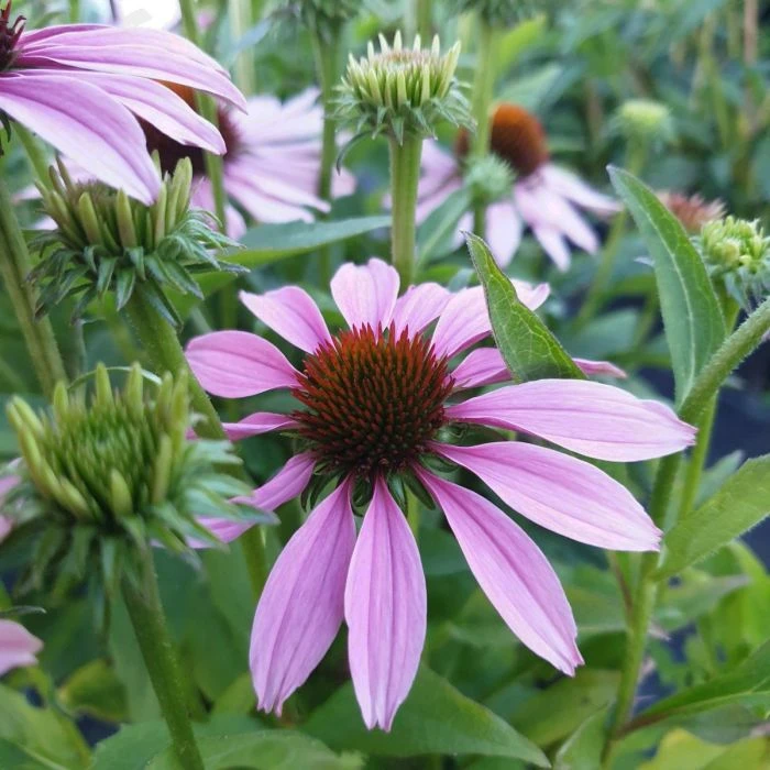 Neuheit! Sonnenhut Echinacea Conetto Melon bildet große, pastellrosafarbene Blüten mit schönem Blütenkranz. Die Sonnenhut Pflanze hat einen niedrigen und kompakten Wuchs und ist besonders reichblühend. Der Sonnenhut sorgt für viel Farbe im Staudenbeet während der langen Blütezeit. Das gelegentliche Entfernen verblühter Blüten sorgt für eine längere Blütezeit. Dauerhafte Staude für vollsonnige Standorte. Auch schön im Kübel auf der Terrasse oder Balkon. Winterschutz wird empfohlen.