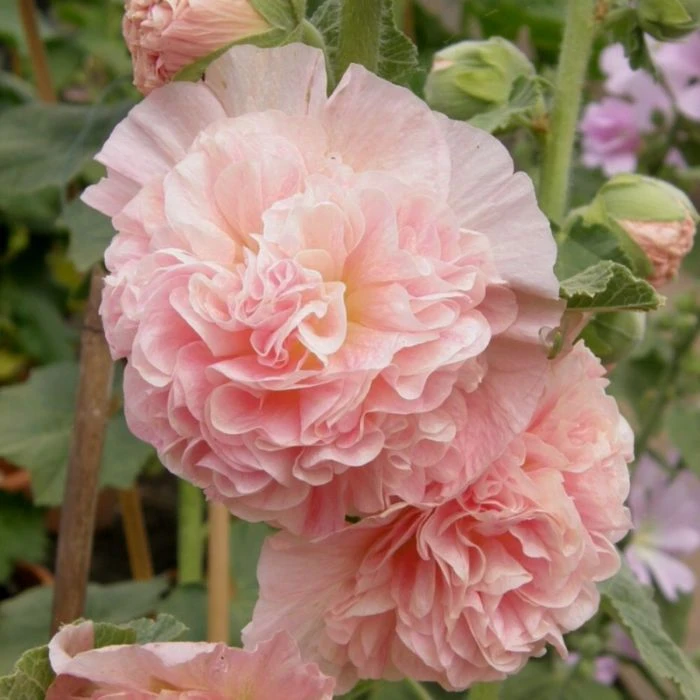 - Die Stockrose ‚Pleniflora Chaters Apricot‘ ist eine auffällige Staude mit großer Wuchshöhe und großen Blüten.