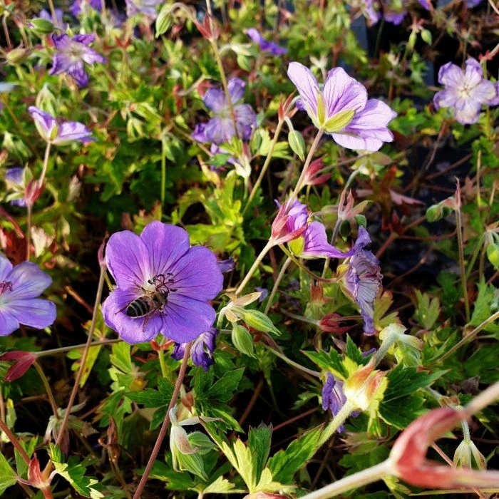 Geranium Rozanne zeigt während der besonders langen Blütezeit einen dichten Teppich aus großen, blauvioletten Blüten. Der wüchsige Storchschnabel ist ein guter Bodendecker, aber auch für die Kübelpflanzung geeignet. Sehr blühfreudig und pflegeleicht. Die farbenfrohen Blüten verströmen einen angenehmen Duft und ziehen viele Bienen und Schmetterlinge an.