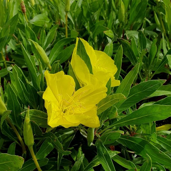 Auch Polster Nachtkerze oder Gemeine Nachtkerze genannt. Die Sorte ist zierlich und kompakt. Dennoch begeistert sie mit großen, leuchtend gelben Trichterblüten und ziehen Bienen und Schmetterlinge magisch an. Tagsüber ist die Blüte meist geschlossen und öffnet sich erst am späten Nachmittag – auch um Nachtfalter anzuziehen. Diese stark duftende Nachtkerze ist gut trockenheitsverträglich und eignet sich auch für den Steingarten oder Trockenmauern. Schöne Beet- oder Kübelstaude. Durch die lange Blütezeit und die reichhaltige Blüte sorgt die Pflanze für Farbe im Staudenbeet. Ideal für warme, sonnige Standorte.